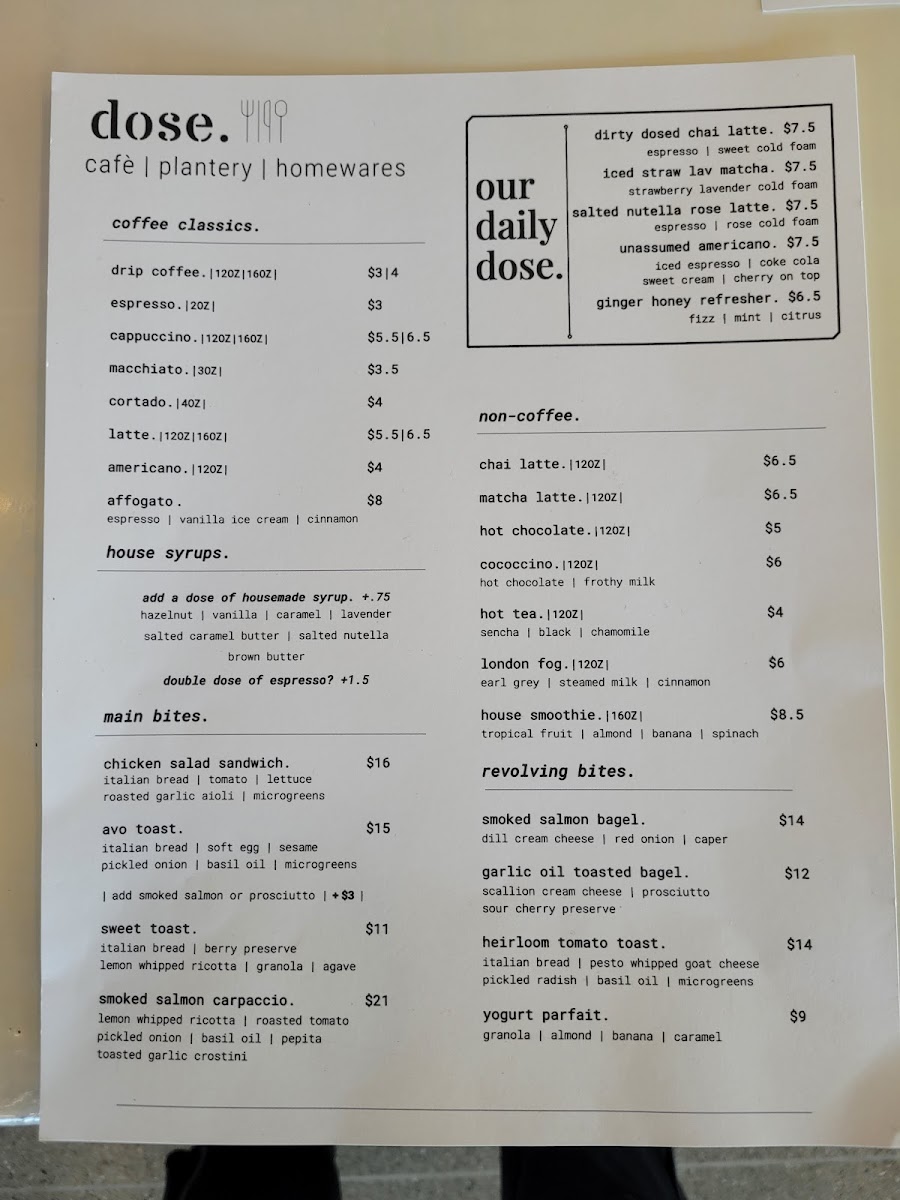 At dose. detroit, the menu showcases a variety of unique drinks and delicious bites. Indulge in their expertly crafted Chai Latte or the decadent Salted Nutella Rose Latte, both celebrated for their inventive flavors. For something savory, the Egg Salad Toast and Smoked Salmon Carpaccio are highlights, bursting with freshness and culinary creativity. Customers rave about the cozy ambiance filled with natural light and lively plant decor, creating an inviting space to enjoy every culinary experience.